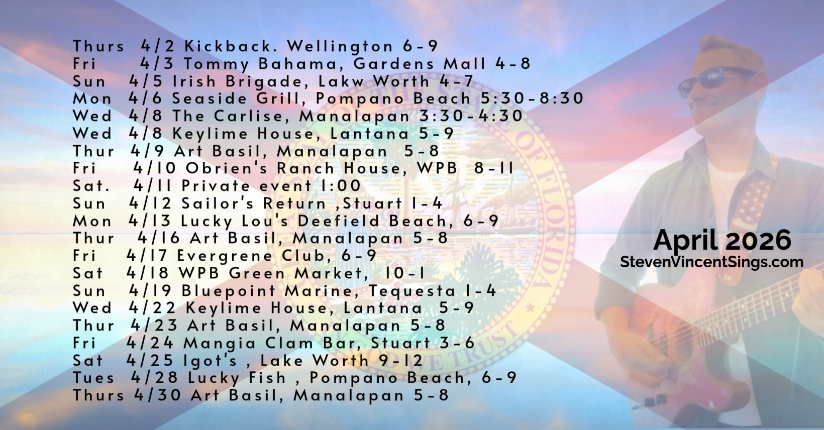 Steven Vincent is an acoustic singer/songwriter who plays guitar and piano and plays “a little bit of everything.” From covers to originals, Steven travels around Palm Beach County Florida playing at some amazing venues. Be sure to listen on Spotify and Youtube and follow his live shows!